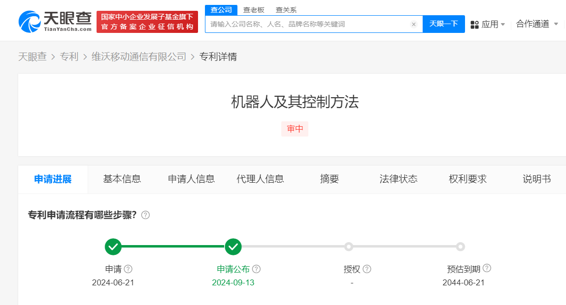 天眼查知识产权信息显示,近日,维沃移动通信有限公司申请的“机器人及其控制方法”专利公布。
