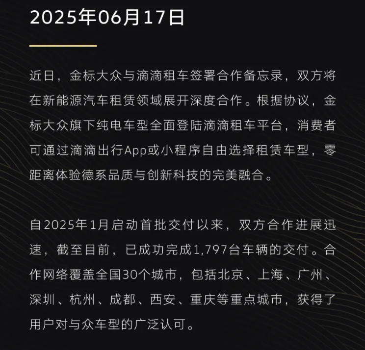 6月17日,大众安徽发文宣布,金标大众与滴滴租车携手合作,打造租赁运营新范式。文中,大众安徽提及,金标大众与滴滴租车签署合作备忘录,双方将在新能源租赁领域深度合作。根据协议,金标大众旗下纯电车型将全面登陆滴滴租车平台,消费者可通过滴滴出行App由选择租赁车型。