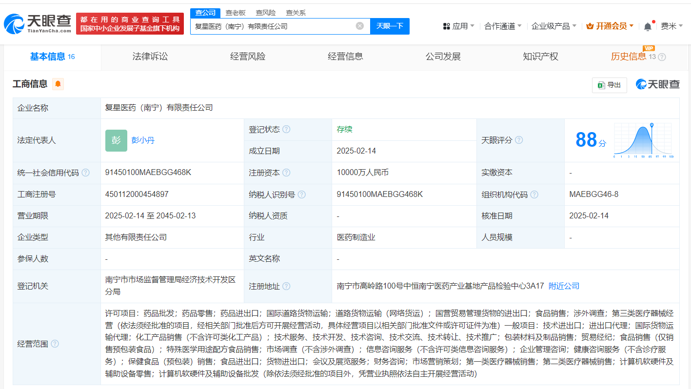 天眼查App显示,近日,复星医药(南宁)有限责任公司成立,法定代表人为彭小丹,注册资本1亿人民币,经营范围含药品批发、药品零售、药品进出口、国际道路货物运输、食品进出口、第二类医疗器械销售等,由复星医药(600196)旗下上海复星医药产业发展有限公司以及中恒怡鑫科创投有限公司、南宁产投统一投资集团有限责任公司共同持股。