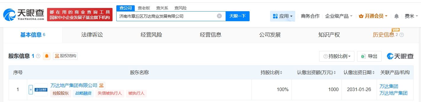 天眼查App显示,近日,济南市章丘区万达商业发展有限公司成立,法定代表人为田臣,注册资本1000万人民币,经营范围为商业综合体管理服务、以自有资金从事投资活动、非居住房地产租赁、物业管理。股东信息显示,该公司由万达地产集团有限公司全资持股。