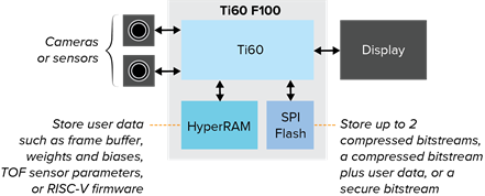 Efinix Ti60 F100 内含价值60K的逻辑和高速I/O,可针对各种通信协议进行配置,此外还集成了SPI闪存和HyperRAM,且全部封装在0.5mm球间距的微型5.5 mm2 封裝中。通过结合FPGA逻辑和数据存储,Ti60 F00 成为了适用于各种相机和传感器系统的最佳解决方案。借助SPI闪存,设计人员无需配备外挂独立内存,而HyperRAM可用于存储用户数据。客户可将HyperRAM用作视频的帧缓冲器,用于存储AI的权重和偏差、存储飞行时间(TOF)传感器的参数,或存储RISC-V SoC的固件。
