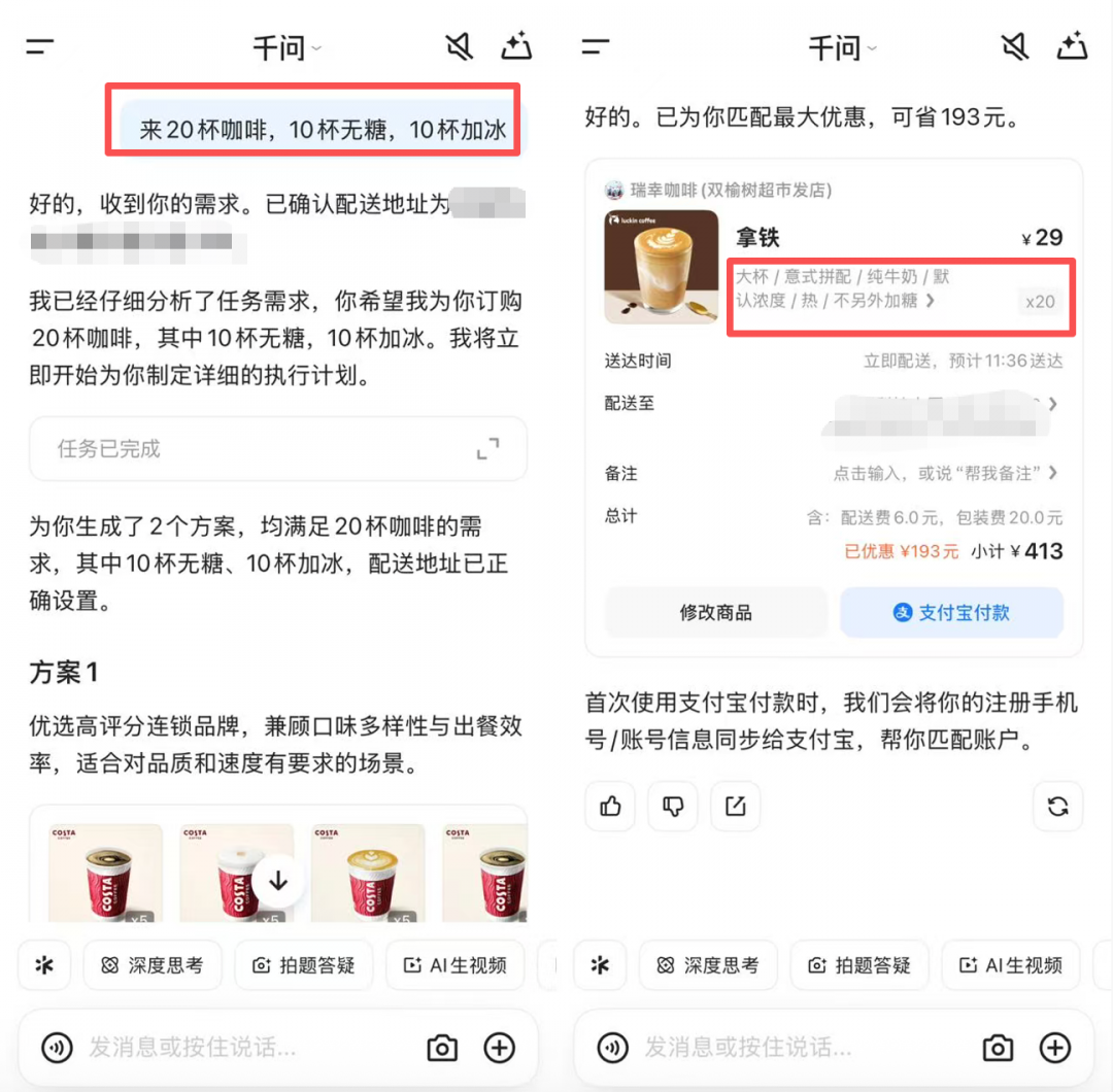 此外,生活中还有很多更复杂的点单需求,比如聚餐时想要“20杯咖啡,10杯无糖,10杯加冰”。千问正在内测的“任务助理”功能可以完成这些复杂任务,但从目前的体验来看,结果还不十分精准,给出了20杯热的无糖咖啡。