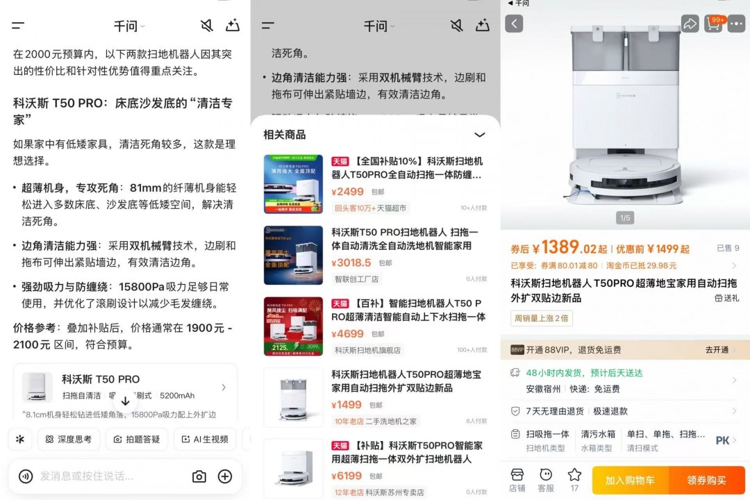 千问的AI购物功能与此类似。比如,在对话框输入“想买一个扫地机器人,预算2000元以内”,千问给出了两个方案,一个针对无死角清洁,一个针对大户型,点击商品卡片,可以看到不同类型和价位的商品列表,选定后即可跳转至淘宝下单购买。