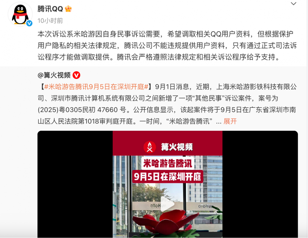 “米哈游告腾讯”冲上热搜 腾讯QQ回应快讯