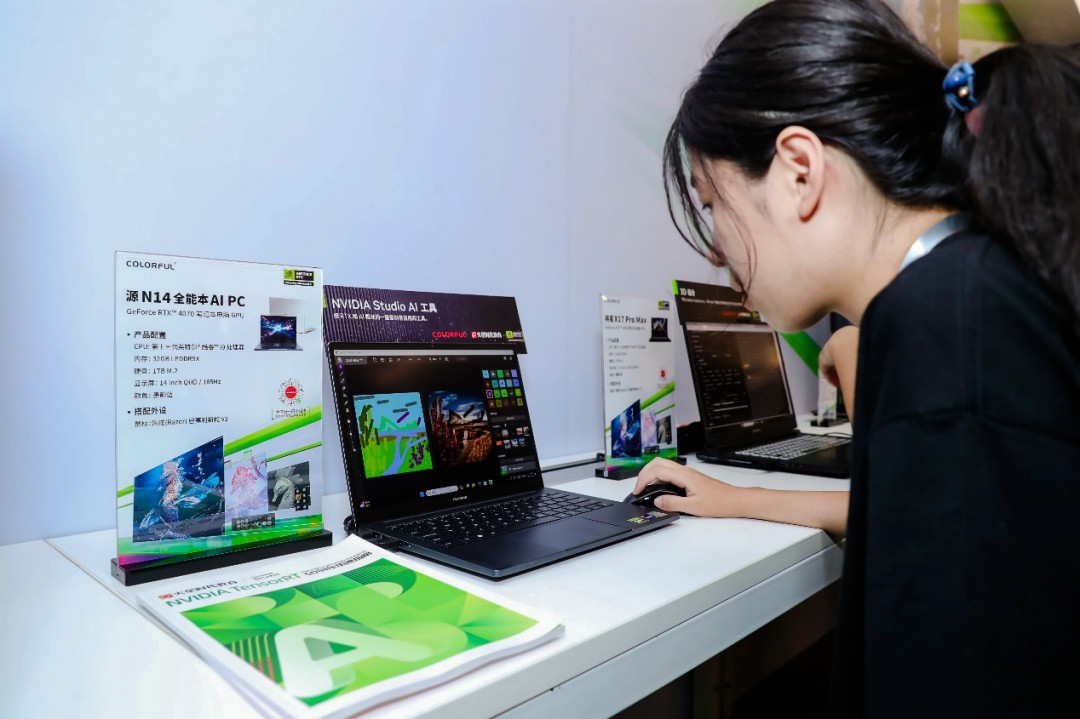 在活动现场的七彩虹笔记本类产品,除了有将星系列之外,也有一款相当亮眼的新品,那就是「七彩虹 源 N14全能笔记本电脑」。这款笔记本电脑同样搭载了高性能的GeForce RTX 4070笔记本电脑GPU,以其全面而强大的功能,满足了各类创作者对于移动生产力工具的需求。在“源N14”中展示了基于Canvas的AI绘图技术。在RTX GPU的强大支持下,源N14竟将简单的笔触瞬间转化为栩栩如生的风景图。对于那些需要在移动中保持高效创作的用户来说,这些集成了先进AI技术的AIPC笔记本电脑,无疑是提升工作效率、激发创作灵感的理想选择。