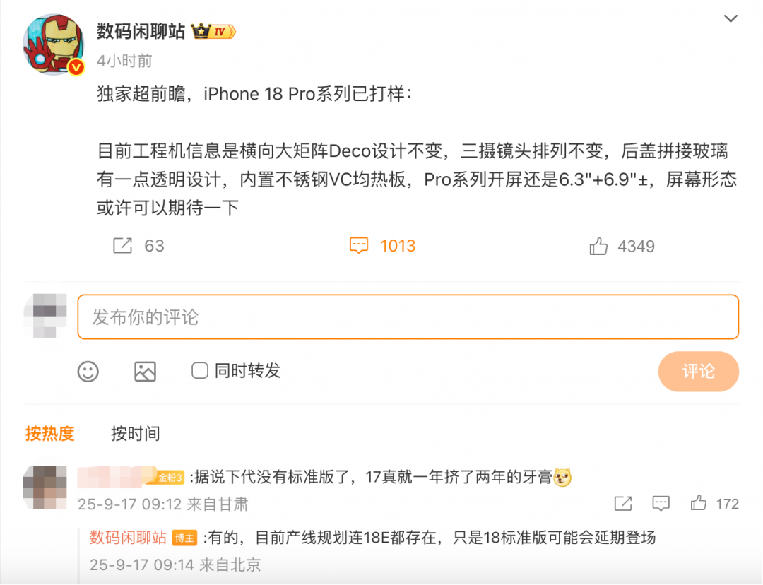 【TechWeb】9月17日消息,数码博主@数码闲聊站在微博发布独家超前瞻,称iPhone 18 Pro系列已打样。