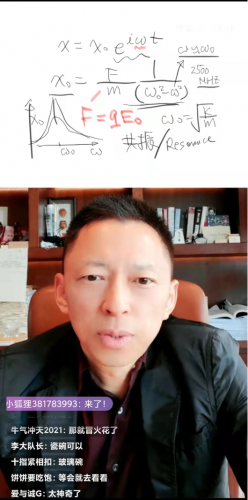 张朝阳画了弹簧和小球,弹簧一端连接小球。假设弹簧的劲度系数是k,小球质量为m,计算出小球做简谐振动,得出弹簧对小球的拉力,以及小球的振幅。“周五那天讲了电场和磁场,它们会扰动空气分子。今天增加了有外力驱动的情况下,方程的运算。就是刚才说的简谐运动。”张朝阳说。