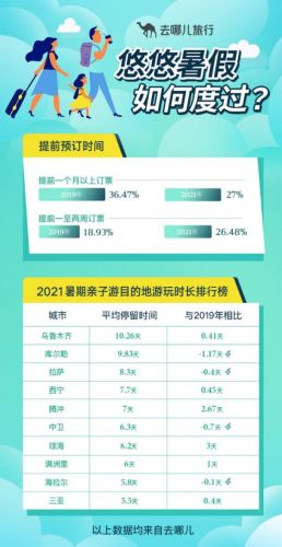 出游习惯的改变不仅体现在预订机票的时间上,与2019年暑期相比,现在的家长们正争分夺秒地挤出时间,希望和孩子度过更多的亲子时光。去哪儿数据显示,2021年暑期亲子游目的地游玩时长排行榜中,超过一半的目的地停留时间超过2019同期。其中乌鲁木齐成为游玩时间最长的目的地,平均停留时间达到10.26天,比2019年多了0.41天。而琼海成为亲子游停留时间增加最多的目的地,比2019年暑期多了3天。