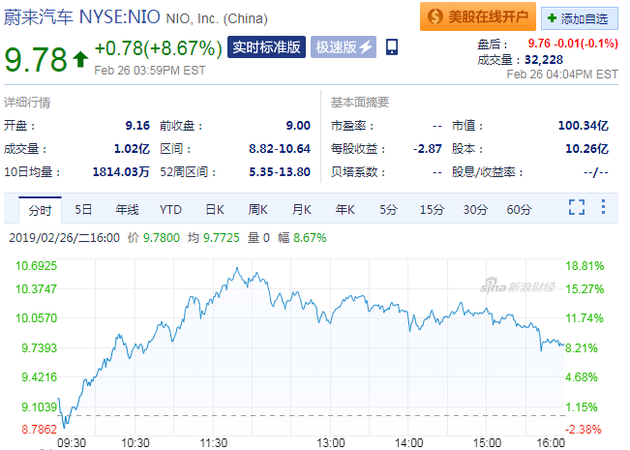 新浪科技讯 北京时间2月27日消息,蔚来汽车周二上涨,盘中一度涨近17%,截至收盘,蔚来汽车报9.78美元,涨幅达8.67%,市值100.34亿美元。
