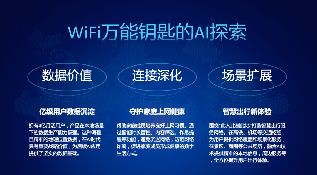 张黎黎首先指出,AI技术的跨越式发展正在重塑用户习惯和产品形态。他提到,尽管AI产品在设计上存在“技术驱动”大于“价值驱动”的现象,但WiFi万能钥匙始终致力于将用户需求放在首位,通过技术创新解决用户的实际问题。WiFi万能钥匙作为全球领先的免费上网平台,拥有数亿月活用户,产品在本地场景下的数据生产能力极强。这种海量且精准的地理位置数据,在AI时代具有重要战略价值,为后续AI应用提供了坚实的数据基础。