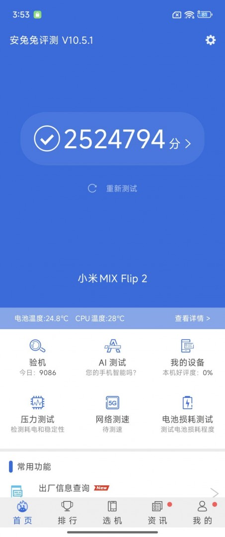 在安兔兔V10版本的跑分测试中,小米MIX Flip 2轻松获得了2524794分,展现出其强大的硬件实力。