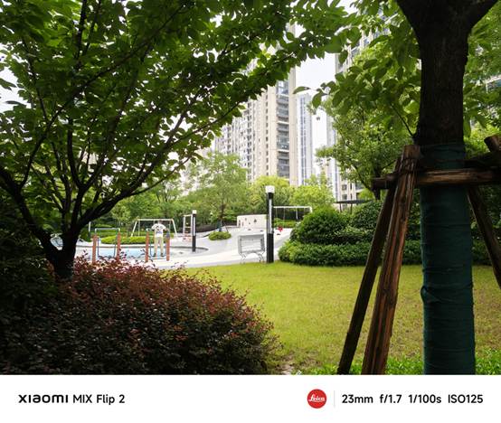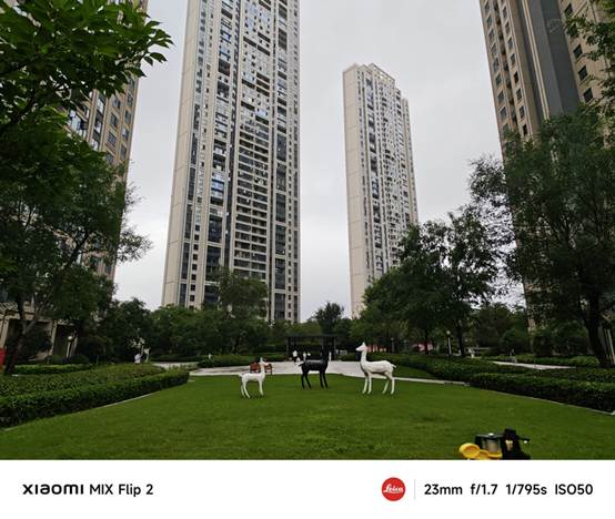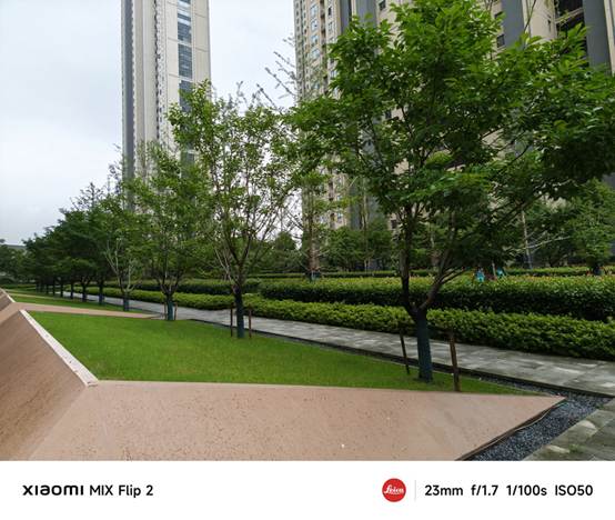 在白天光线充足的情况下,小米MIX Flip 2的拍照表现非常出色。主摄拍摄的照片画面清晰锐利,建筑、树木的纹理和线条清晰可见,色彩还原准确,细节丰富,光影过渡自然,德味十足。无论是拍摄风景、建筑还是人物,都能够呈现出自然、生动的效果。