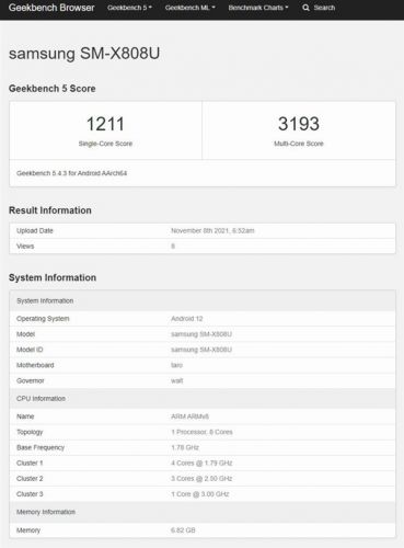 据爆料达人最新晒出的跑分信息显示,三星旗下一款型号为SM-X808U的新设备近日现身Geekbench数据库,结合此前曝光的消息,该机很可能就是全新的三星Galaxy Tab S8+平板。从数据来看,该机将搭载最高主频达3GHz的芯片,也就是近来密集曝光的高通新一代旗舰处理器骁龙898。不过此次该机的单核得分仅1211份、多核得分也仅3193分,与其他机型的数据相差不小,也可能是工程机的缘故。