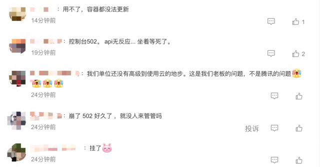 有网友在社交平台留言称,“用不了,容器都没法更新”“控制台502。 api无反应... ”“找了半天的bug,上网一看腾讯云崩了”。还有网友称,“没影响微信,就行了,崩就崩了吧,我也歇会。”“真的崩了,可以下班了”。