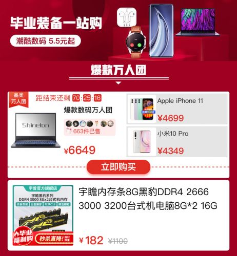 数据显示,7月9日高考结束首日,平台数码产品销量较前一天上涨超过210%,其中,手机、电脑、智能手环/手表、游戏机和耳机位列产品销量排行榜的前五位,合计约占平台数码产品总销量的67%。