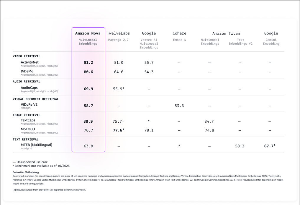 【TechWeb】10月29日消息,亚马逊云科技宣布,Amazon Nova Multimodal Embeddings多模态嵌入模型现已在Amazon Bedrock上线,这是一款专为Agentic RAG与语义搜索应用打造的顶尖多模态嵌入模型。该模型是首个通过单一模型支持文本、文档、图像、视频与音频的统一嵌入模型,能以行业顶尖的准确率实现跨模态检索。