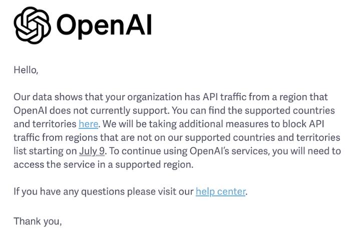 OpenAI官网的帖子显示,推送的邮件通知中指出,自7月9日起,OpenAI将采取额外措施,阻止来自不在OpenAI支持的国家和地区列表中的API流量。如果希望继续使用OpenAI的服务,必须在其支持的国家或地区内访问。
