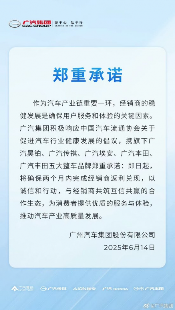 广汽集团表示,“作为汽车产业链重要一环,经销商的稳健发展是确保用户服务和体验的关键因素。广汽集团积极响应中国汽车流通协会关于促进汽车行业健康发展的倡议,携旗下广汽昊铂、广汽传祺、广汽埃安、广汽本田、广汽丰田五大整车品牌郑重承诺:即日起,将确保两个月内完成经销商返利兑现,以诚信和行动,与经销商共筑互信共赢的合作生态,为消费者提供优质的服务与体验,推动汽车产业高质量发展。”(闫妍)