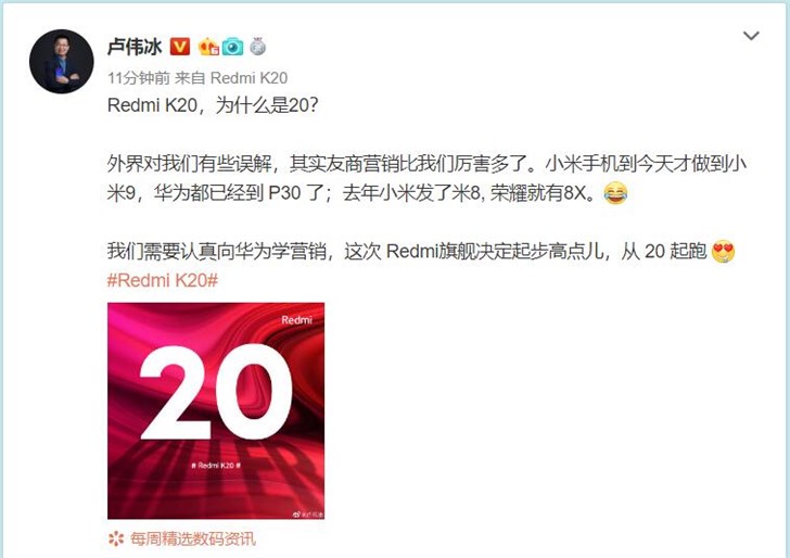 卢伟冰解释为何命名Redmi K20:向华为学习快报