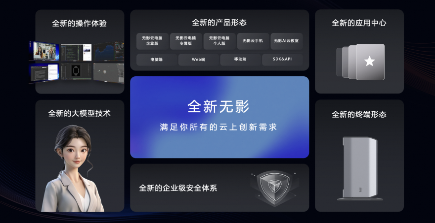 全新无影应用中心 面向所有开发者免费 为了让更多用户体验到云电脑,基于最新的终端云计算技术和AI大模型能力,全新无影AI云电脑 体验大幅升级 云电脑全面超越传统PC 与上一代的云桌面不同。