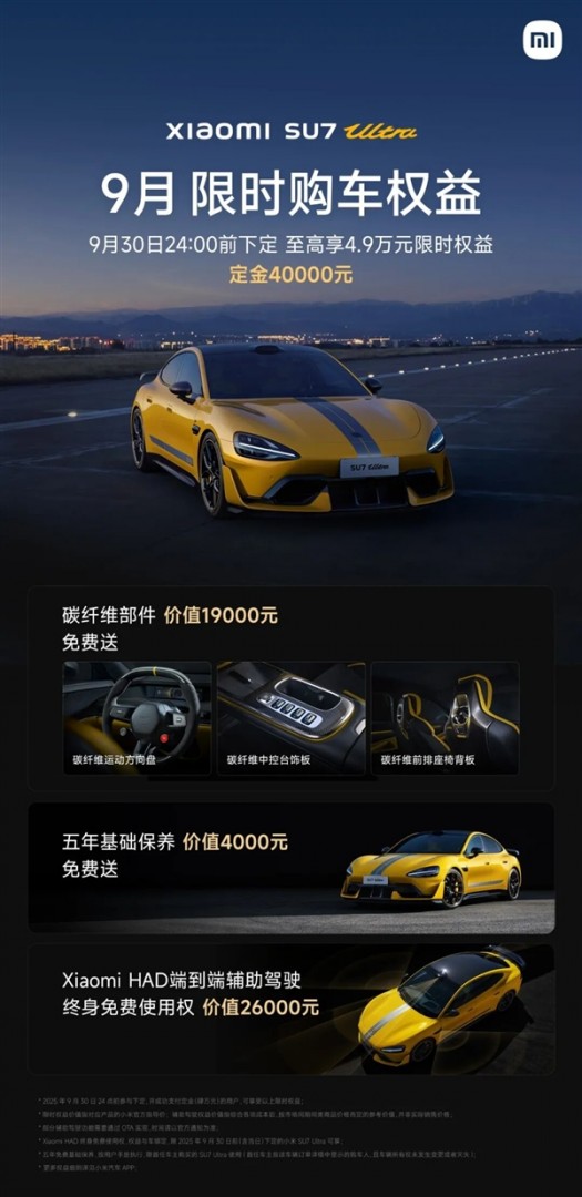 而小米SU7 Ultra车型的权益则更加丰富,包括碳纤维运动方向盘、碳纤维中控台饰板、碳纤维前排座椅背板的免费升级,五年基础保养免费服务,以及Xiaomi HAD端到端辅助驾驶的终身免费使用权。