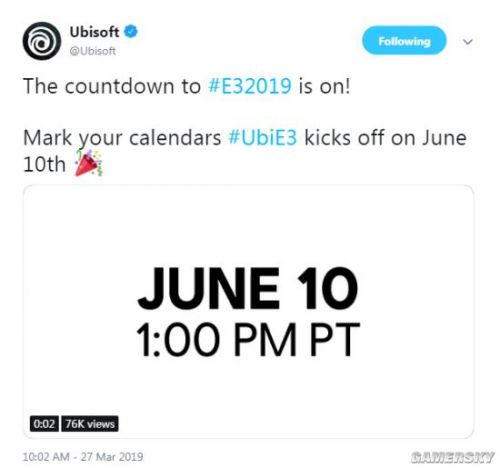 今日,育碧官推宣布2019年E3发布会将于美国东部时间6月10日下午13:00(北京时间6月11凌晨2:00)举行,并发了一段2019年E3宣传片。