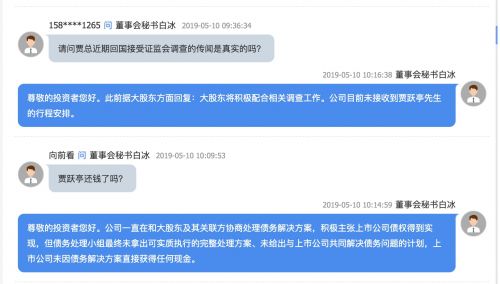 在提问中,不少投资者提到了“贾跃亭将回国配合证监会调查”的传闻,对此,白冰回答称,“此前据大股东方面回复:大股东将积极配合相关调查工作。公司目前未接收到贾跃亭先生的行程安排。”