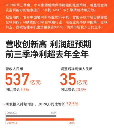 小米集团2019年第三季度总收入人民币537亿,小米2019年前三季度净利润总计92亿元人民币,小米将全力推动5G手机的研发和推广。