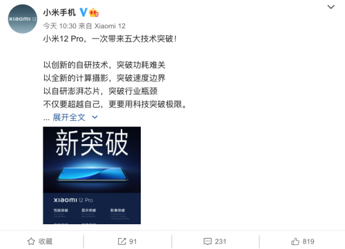 12月28日小米将正式举办小米12系列新品发布会,届时官方将会推出小米12、小米12 Pro等旗舰新品,今天小米CEO雷军发布微博表示,即将发布的小米12 Pro将为用户带来五大技术新突破,这些技术突破解决了多个技术难关,还填补了行业空白。