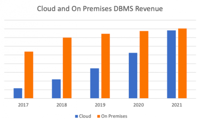 2017-2021云DBMS和本地DBMS收入:云上数据库收入逐年快速提升