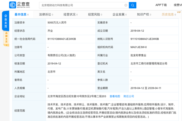 信息显示,桔财动力经营范围包括:技术开发推广服务;企业管理咨询;基础软件服务;火车票销售代理;航空机票销售代理;汽车租赁(不含九座以上乘用车);酒店管理;小客车代驾服务;境内旅游业务。