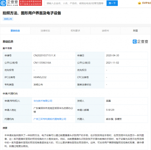 【TechWeb】企查查APP显示,11月2日,华为技术有限公司公开“拍照方法、图形用户界面及电子设备”专利,公开号为CN113596316A。
