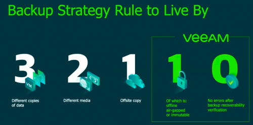 针对数据安全保护Veeam曾提出 “3-2-1”规则,即每个数据都必须有3个备份、要有2个不同的媒介来储存、1个必须是异地备份。Veeam产品战略的高级总监Rick Vanover介绍,当今不断升级的攻击威胁使得数据保护需要超越3-2-1的规则。2021年Veeam提出了“3-2-1-1-0”规则,新增加的这个“1”是数据离线备份/不可变备份,“0”是零恢复错误。这个新配方对于企业应对勒索软件非常有效。