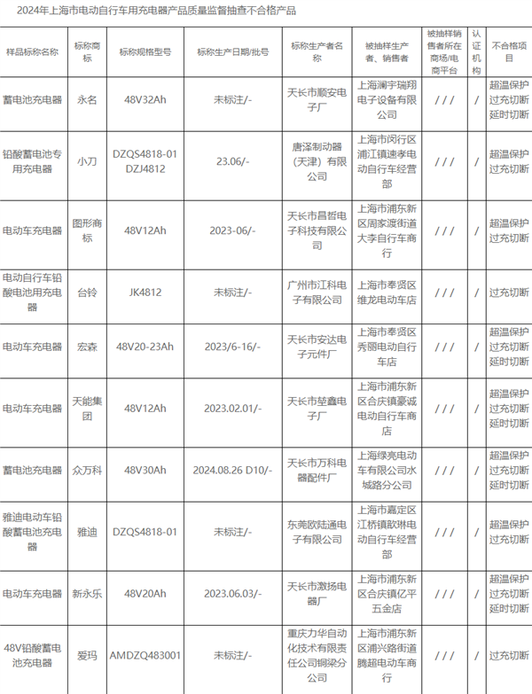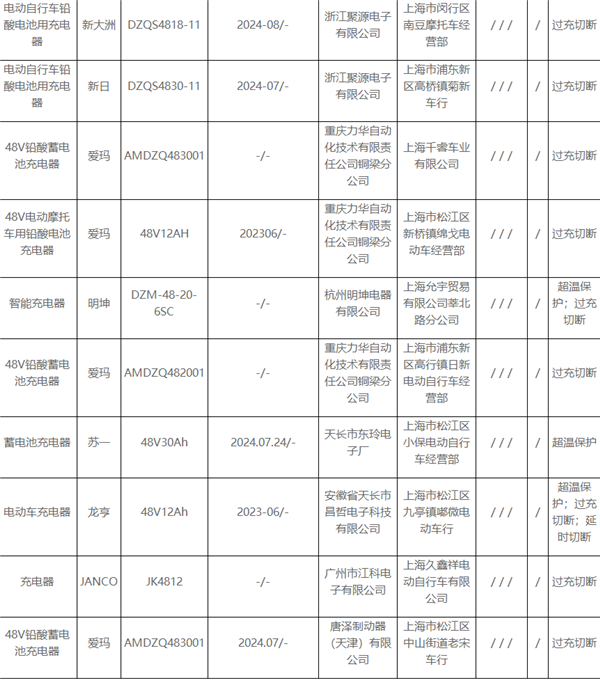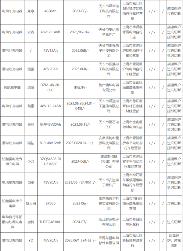不合格产品包括唐泽制动器(天津)有限公司生产的“小刀”铅酸蓄电池专用充电器,广州市江科电子有限公司的“台铃”电动自行车铅酸电池用充电器,东莞欧陆通电子有限公司的“雅迪”电动车铅酸蓄电池充电器,重庆力华自动化技术有限责任公司铜梁分公司生产的“爱玛”48V铅酸蓄电池充电器,以及南京西普尔科技实业有限公司的“新大洲”铅酸蓄电池充电器等。