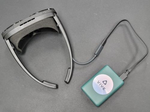 那么问题来了,其他厂商就没考虑到头显重量对佩戴体验的毁灭性打击吗?也不尽然。相对来说,镜片和芯片这些VR一体机必备的组成部分,并不会有太过分的重量,造成重量超标的最大组成部分,主要来自于内置电池。HTC VIVE Flow这次一反常态,通过右部镜腿处所伸出的线缆,直连移动电源,继而给一体机供电,充分解决了内置电池重量负担的问题。实际体验过程中,我习惯于连接一根较长的线缆,直接插入放在兜里或者背包中的移动电源,这就完全不会给头部颈部造成任何负担感,可谓贴心。