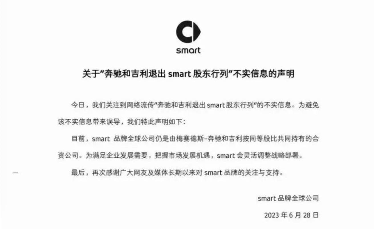 文|李佳璐 李皙寅 编辑 | 李皙寅 三年前,梅赛德斯-奔驰和吉利双方牵手,诞下一子——智马达汽车,生产smart品牌智能电动车,彼时被看作中德两大头部企业的重磅合作。 近日,据工商信息登记系统显示,smart品牌母公司——智马达汽车有限公司发生了股权变更,智马达汽车有限公司,公司股东由吉利汽车集团有限公司和梅赛德斯-奔驰股份有限公司变成SMART MOBILITY PTE.LTD. 和 SMART MOBILITY INTERNATIONAL PTE.LTD. 成为控股股东,分别持股 50%。 一时间,有媒体报道称奔驰与吉利分手,不再持股smart,并由此展开诸多解读。6月28日,smart发布对外声明,否认“奔驰和吉利退出smart股东行列”这一不实消息。声明表示,奔驰和吉利仍然是smart的重要股东,并将继续支持smart品牌的发展。同时,智马达公司方面的相关人士对财经汽车(ID:caijingqiche)表示,穿透股权来看,吉利和戴姆勒仍是公司股东,双方同等持股不变。
