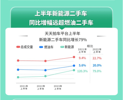 此外,天天拍车的数据显示,新能源二手车上半年成交量比2021年上半年增长120.3%,比2022年上半年增长79%,远高于同期平台燃油二手车和整体二手车增幅。可以说,新能源汽车蓬勃发展将逐渐成为汽车产业及消费转型的重要阶段,也将为包括二手车市场在内的汽车产业带来新的市场机遇。