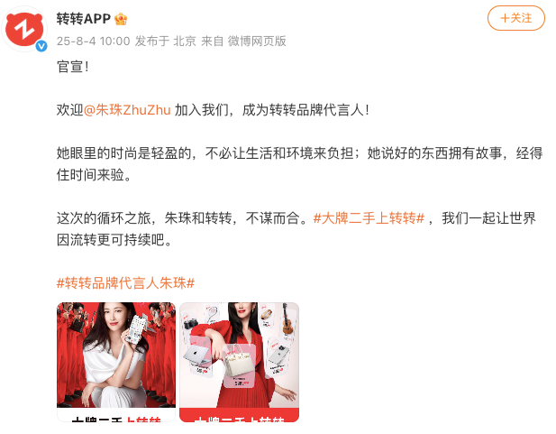 黄炜介绍,此次和朱珠的合作将重点助力转转集团“百类千品”战略的全面推进,随着朱珠的加入,将为集团战略落地注入新动能——其多元化的时尚形象和跨圈层影响力,有望吸引更多年轻用户和女性群体关注二手交易,进一步打破消费者对闲置商品的传统认知,从而加速优质闲置资源的流转和再利用。