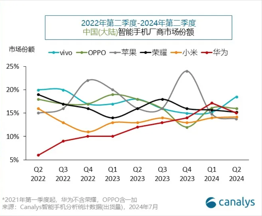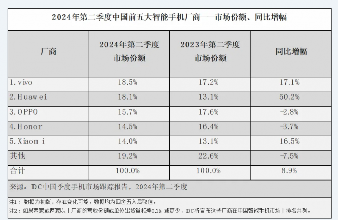 二季度,中国前五大智能手机厂商分别为vivo、Huawei、OPPO、Honor、Xiaomi,所占市场份额分别为18.5%、18.1%、15.7%、14.5%、14%。