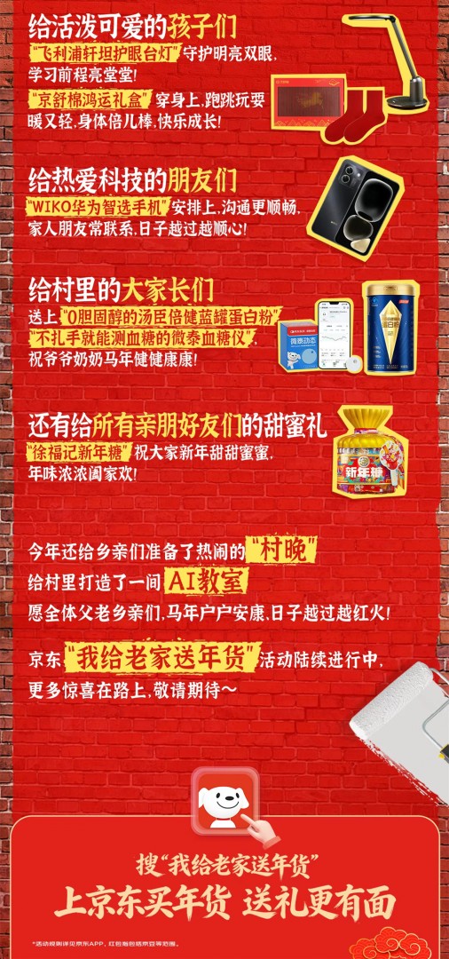 2026年春节,刘强东给光明村乡亲们的年货包括:OPPO、华为手机,福临门米面油,电热毯,微波炉,筋膜枪,护眼台灯,蛋白粉,血糖仪等。还要给村里打造一间AI教室,提供早教益智、阅读成长、乐趣对弈、3D创意等。