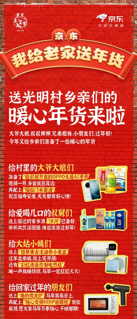 【TechWeb】1月26日消息,刚刚,京东官微发布消息,京东正式开启2026年”我给老家送年货”活动,首站光明村。同时,还宣布1月28日晚将在光明村上演一场特别的”村晚”。