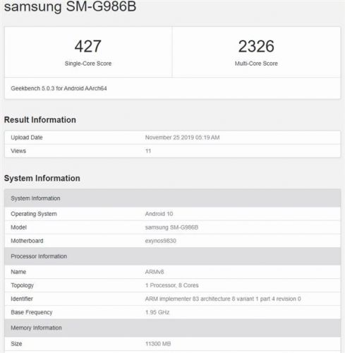根据GeekBench跑分数据库显示的信息来看,与此前曝光的信息基本一致,除了基本义确认的高通骁龙865移动平台外,全新的三星Galaxy S11系列还将提供搭载三星自家最新旗舰平台——Exynos 9830芯片的版本,该芯片基于7nm工艺制程打造,采用双核第五代三星定制高性能核心,搭配双核Cortex A76核心与四核Cortex-A55核心,并配有双核NPU提升AI运算能力,GPU为ARM新一代Mali-G77 MP11,能效比Exynos 9820 Mali-G77 MP12提升20%。不过令人意外的是,其单核得分仅427分,多核得分也仅2326分,这不仅达不到骁龙865的水准,距离前代旗舰芯片骁龙855Plus也有比较大的差距,推测应该是工程机的缘故,后期优化后还将有大幅的提升。