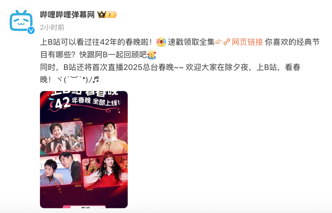 B站上线42年全部春晚 蛇年春晚直播预约数超300万快讯