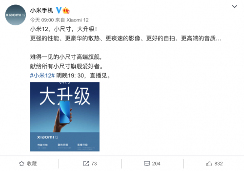 今天,小米官微发文表示,“小米12,小尺寸,大升级,更强的性能、更豪华的散热、更疾速的影像、更好的自拍、更高端的音质,难得一见的小尺寸高端旗舰,献给所有小尺寸旗舰爱好者。”