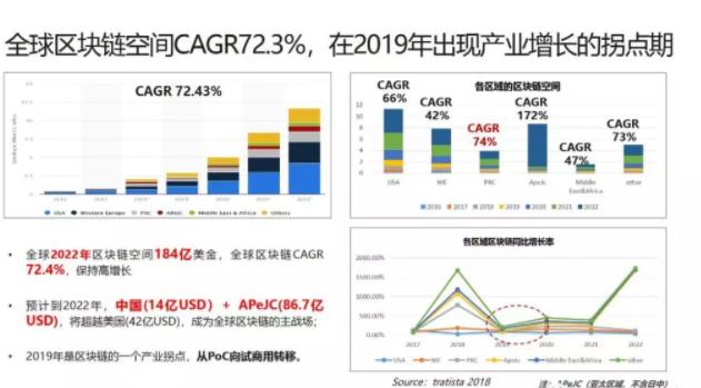 在其报告中,华为表示,全球区块链空间CAGR为72.3%,且将在2019年出现产业增长拐点期。而接下来的三年则是区块链技术能否成功的关键三年,标准和项目都将决定技术可否大面积转为商用。