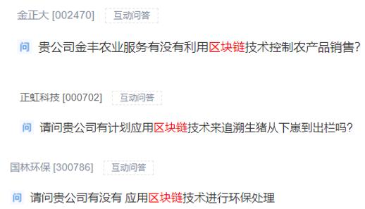 无论是养猪股抑或是农业股、环保股均被股民问询是否在主营业务中利用区块链技术,不过上述公司均尚未进行回应。