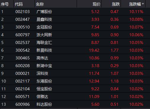 具体到个股上,广博股份、浙大网新、新湖中宝、金冠股份等均涨停。