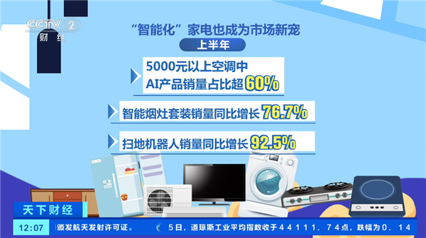 平台数据显示,今年上半年,县域家电市场加速提档升级,“大尺寸、大容量”家电成为深受消费者欢迎的品类,“智能化”家电也成为市场新宠。上半年,5000元以上空调中,AI产品销量占比超过60%,智能烟灶套装、扫地机器人销量同比分别增长76.7%、92.5%。
