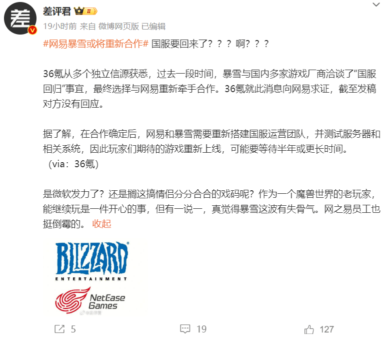 毕竟今年传的风风雨雨的腾讯、字节、完美世界,谁想吃下暴雪的国服代理都不是件容易事。