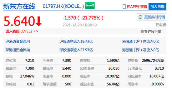 12月29日下午消息,香港恒生指数收跌0.83%,恒生科技指数跌1.75%,刷新纪录新低。教育、互联网科技等板块下挫,新东方在线大跌21%,京东超2%。恒腾网络逆市大幅收涨33%。